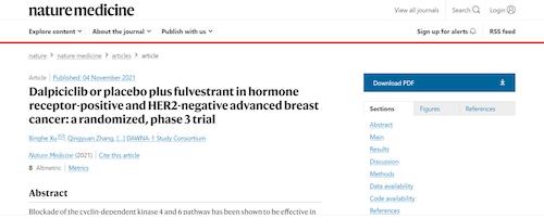 11月4日,国际四大医学期刊之一、英国《自然》旗下《自然医学》(Nature Medicine)在线发表CDK4/6抑制剂达尔西利(SHR6390)联合氟维司群治疗既往内分泌治疗后疾病进展的HR+/HER2-晚期乳腺癌的多中心、随机、双盲III期临床研究(DAWNA-1研究)中期分析结果报告,首次对氟维司群(雌激素受体降解剂)±达尔西利治疗激素受体阳性晚期乳腺癌的有效性和安全性进行了比较。研究结果显示,达尔西利+氟维司群组与安慰剂+氟维司群组相比,无进展生存期(PFS)显著延长。该项研究由中国医学科学院肿瘤医院徐兵河教授担任leading PI,全国39家医院参研,由AG官网医药临床研发团队支持完成。