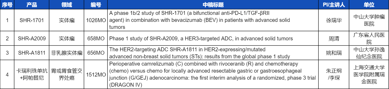 本次ESMO大会,将由中山大学肿瘤医院徐瑞华教授、广东省人民医院周清教授、中山大学孙逸仙纪念医院姚和瑞教授、上海交通大学医学院附属瑞金医院李琛教授分别就4项AG官网医药创新产品相关研究做口头报告,包括SHR-1701、SHR-A2009、SHR-A1811这3款未上市创新产品的实体瘤治疗临床研究,以及1项“双艾”组合(卡瑞利珠单抗联合阿帕替尼)治疗局部晚期可切除胃/胃食管交界处癌的Ⅲ期临床试验期中分析。