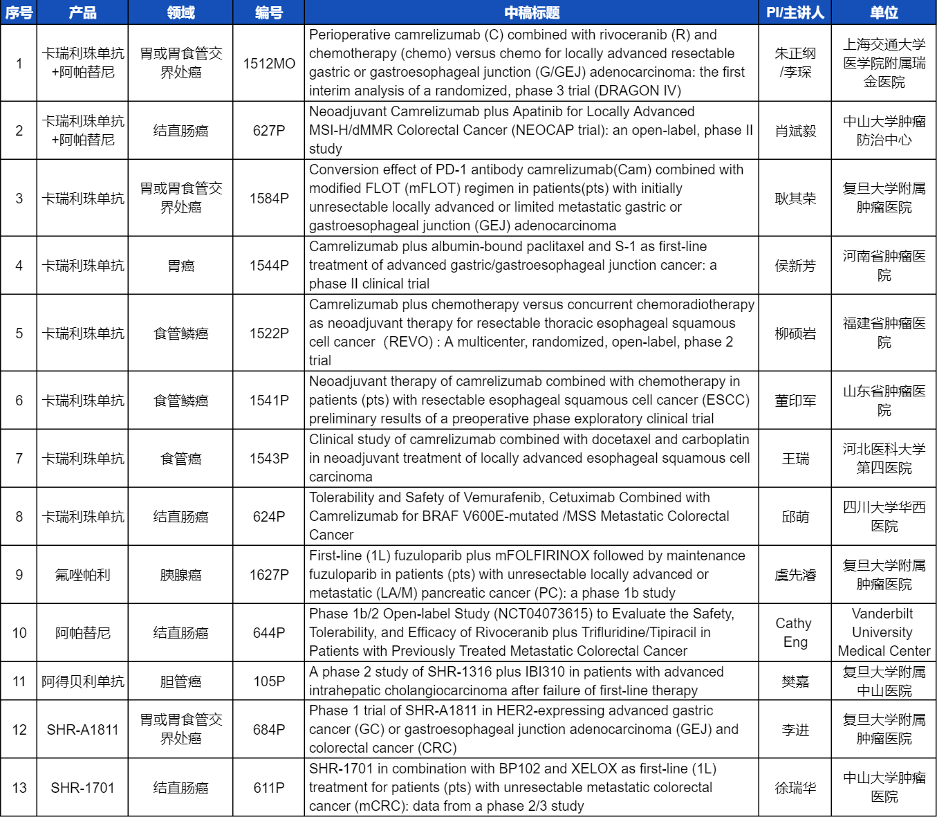 在消化系统肿瘤领域,AG官网创新产品相关研究共入选1项口头报告和12项壁报展示。除了经典的明星药物卡瑞利珠单抗和阿帕替尼,SHR-A1811、SHR-1701等未上市创新产品也有相应研究入选。此外,阿得贝利单抗、氟唑帕利等已上市药物也在积极探索新的适应症,本次ESMO大会分别有肝内胆管癌和胰腺癌相关研究入选。这些新老药物前沿研究的不断出现,有望为消化系统肿瘤患者带来新的福音!