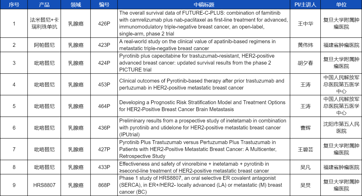 在乳腺癌领域,吡咯替尼、阿帕替尼、卡瑞利珠单抗、法米替尼,或产品间联合或联合化疗,共有9项研究入选壁报讨论,其中吡咯替尼占据6项,较为全面地展示了这款中国首个自主研发抗HER2靶向药在乳腺癌治疗中的显著特点和潜力。此外,AG官网医药自主研发的新型选择性雌激素受体共价拮抗剂(SERCA)HRS8807治疗ER+/HER2-局部晚期或转移性乳腺癌的Ⅰ期研究也成功入选,有望为此类患者带来更多用药新选择。