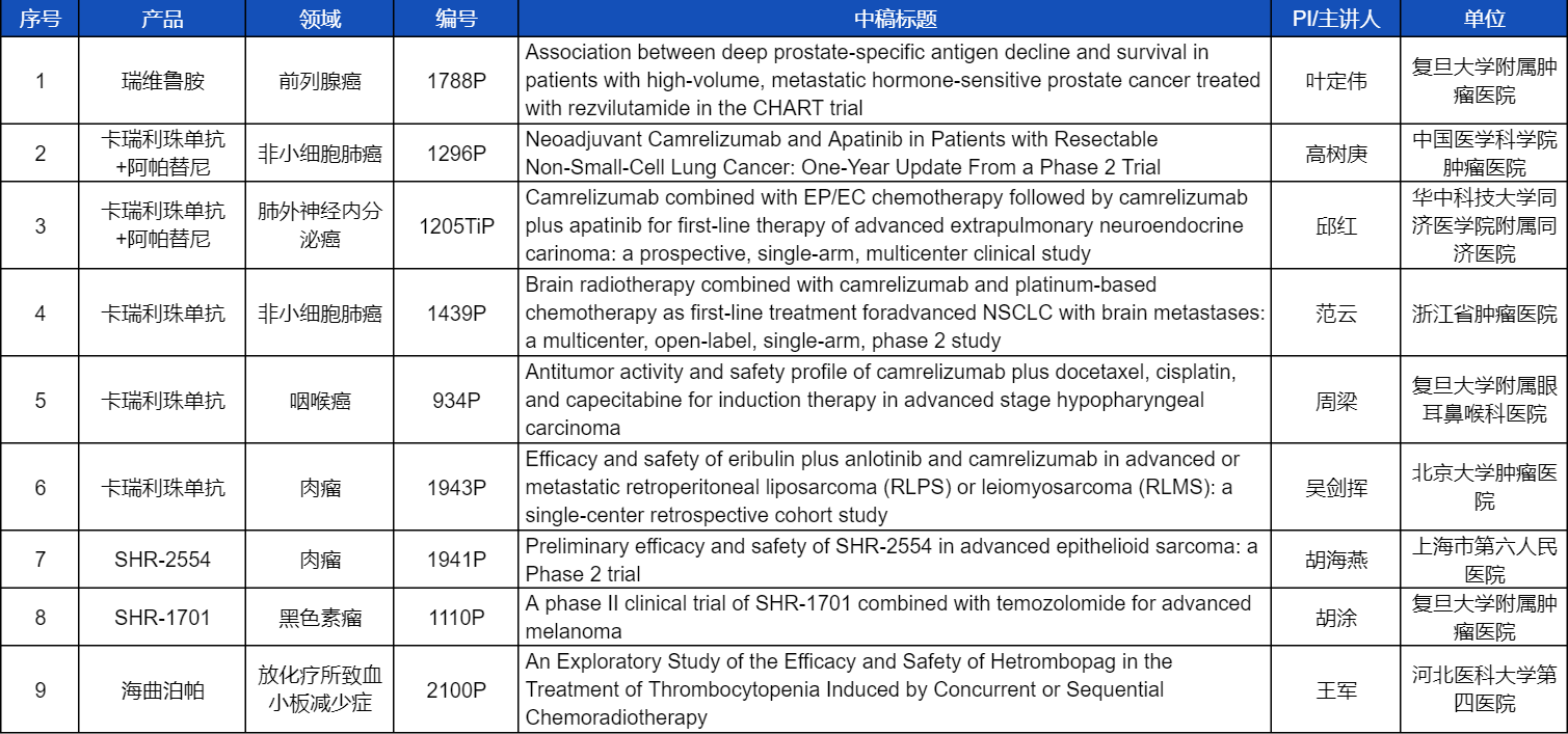 在非小细胞肺癌、咽喉癌、肉瘤、前列腺癌、黑色素瘤等多个领域,卡瑞利珠单抗、阿帕替尼、瑞维鲁胺、SHR-1701、SHR2554等创新产品相关研究一共入选了8项壁报展示。此外,AG官网医药自主研发的血小板生成素受体激动剂(TPO-RA)海曲泊帕在放化疗所致血小板减少领域的探索性研究显示良好的疗效,入选壁报展示。